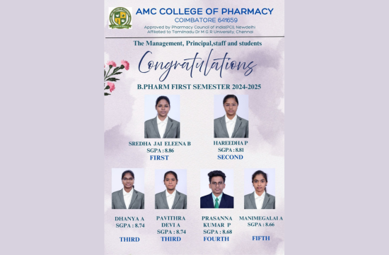 At AMC College of Pharmacy, we offer a curriculum that blends theoretical knowledge with hands-on practical training, ensuring our students are well-prepared to meet the evolving demands of the pharmaceutical industry. The institution is equipped with modern laboratories, a well-stocked library, and experienced faculty who are committed to nurturing the academic and personal growth of each student.